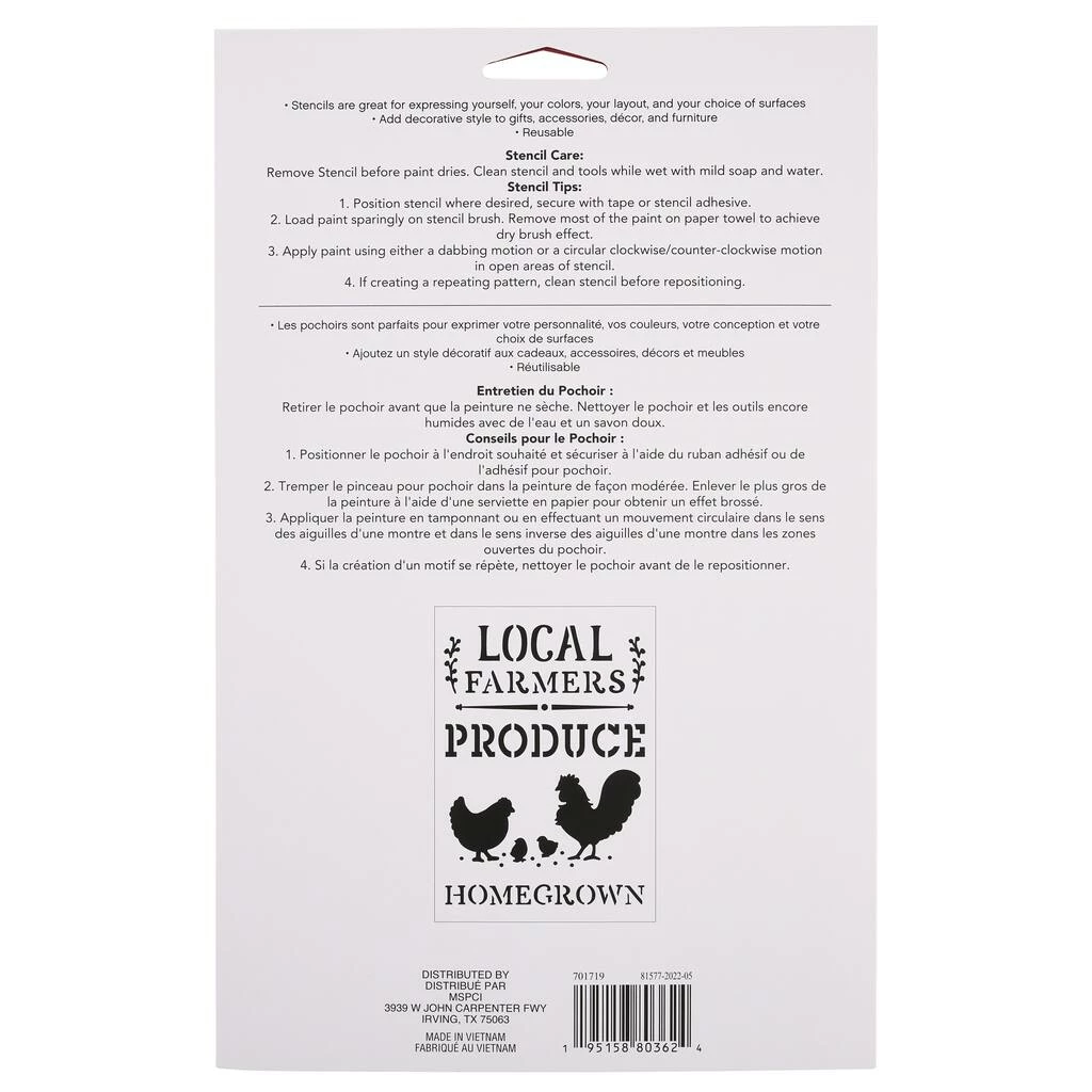 This sheet of stencils from Craft Smart can be used to add a lovely bit of farmer’s market-inspired charm in your kitchen dΓ©cor and craft projects. Use the chicken silhouettes and produce-related words to create fun wall plaques, decorate cannisters for your counter, paint accents on breakfast nook throw pillows and more!