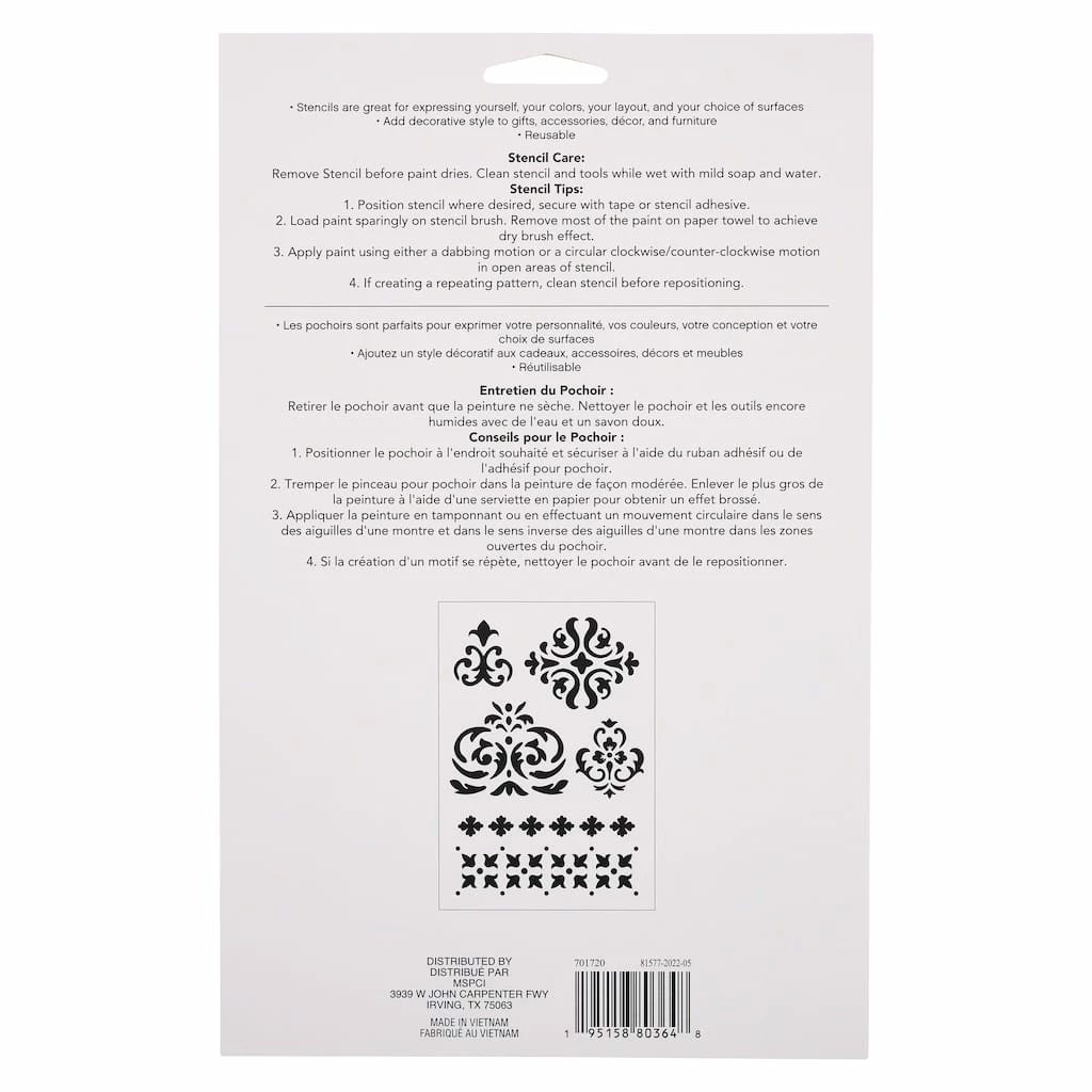 This sheet of stencils from Craft Smart can be used to add a lovely flourish to your home décor and craft projects. Use these pretty patterns and borders to embellish wall plaques, decorate planters, paint accents on throw pillows and more!