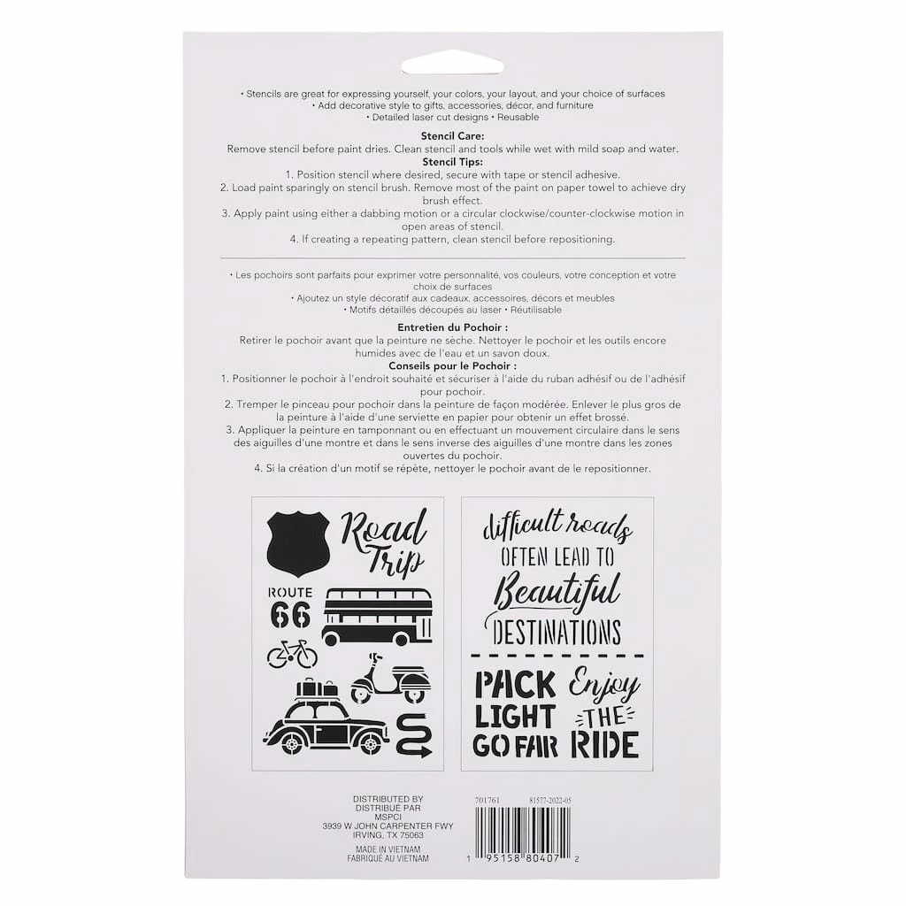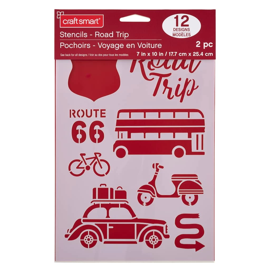 Stencils are great for expressing yourself, your colors, your layout and your choice of surfaces. Use these road trip themed designs to gifts, accessories, dΓ©cor and furniture.
