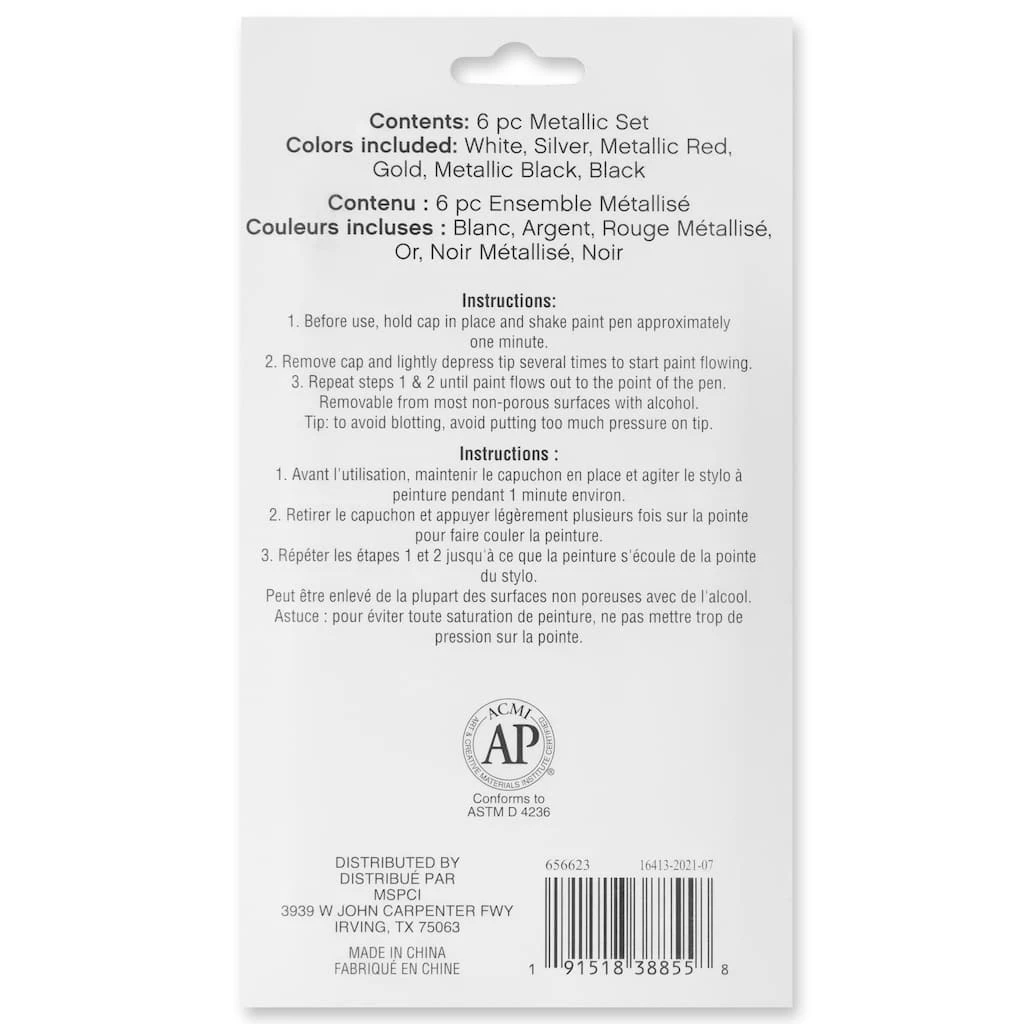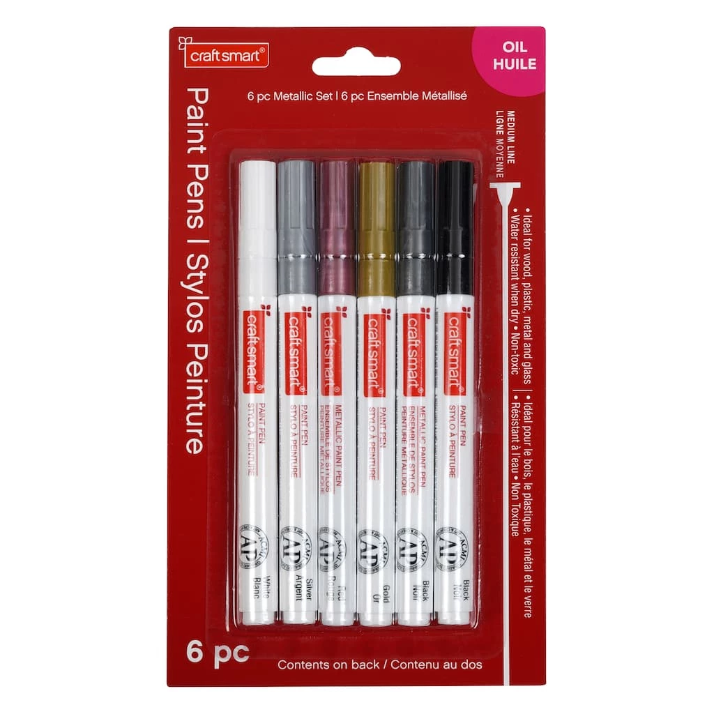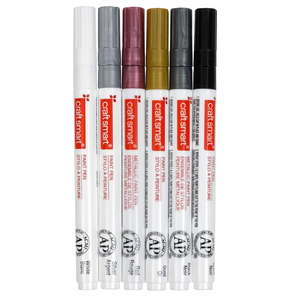 This paint pen set is a must-have for any craft enthusiast’s DIY kit. This set includes 6 medium line tip metallic paint pens that can be used to draw fun patterns on surfaces such as wood, plastic, metal and glass. They are perfect for embellishing glass vases, wooden plaques, plastic bowls and metal tins. The colors included in this set are White, Silver, Metallic Red, Gold, Metallic Black, and Black.