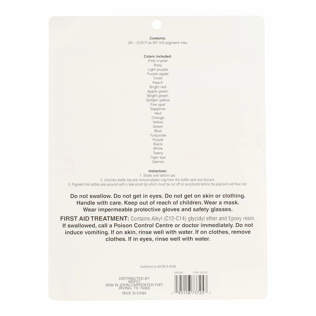 This resin pigment ink set is perfect for adding to your DIY project collection. It contains a variety of hues that are sure to bring your resin art to life! Colors include: Pink Crystal, Rosy, Light Purple, Purple Agate, Violet, Peach, Bright Red, Apple Green, Bright Green, Golden Yellow, Fire Opal, Sapphire, Red, Orange, Yellow, Green, Blue, Turquoise, Purple, Black, White, Tawny Tiger Eye, and Garnet