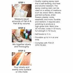 Quality casting and coating epoxy resin that cures to a clear, solid and strong finished with minimal odor. Quality coating epoxy resin that is self-leveling and heat and alcohol resistant. The epoxy coating resin can be use on a variety of medium such as wood, fabric, decals, painted surfaces, dried flowers, plaster, rocks, seashells and more. Durable and resilient it requires zero polishing to produce a high-gloss look. Work time 30 minutes, cures in 12 hours, full strength in 72 hours.
