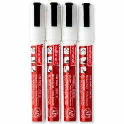 Write, draw and doodle designs on smooth surfaces with this set of 4 white chisel tip chalk markers. These highly opaque wet-erasable markers can be used on chalkboards, windows, mirrors, ceramics and glass.