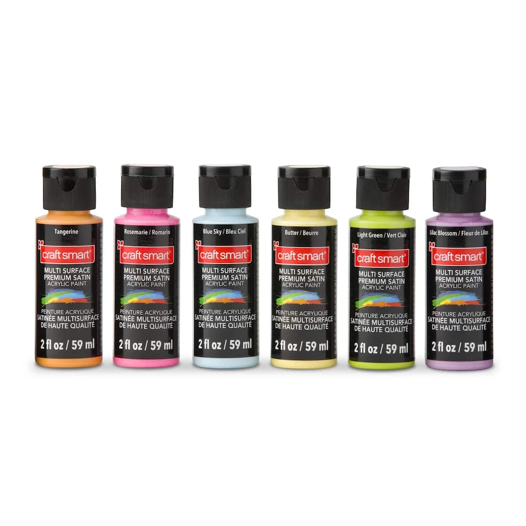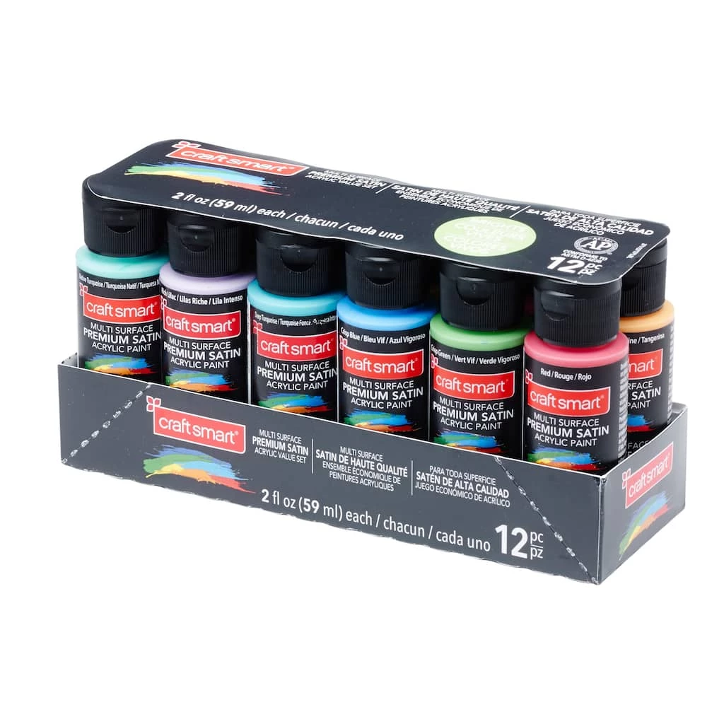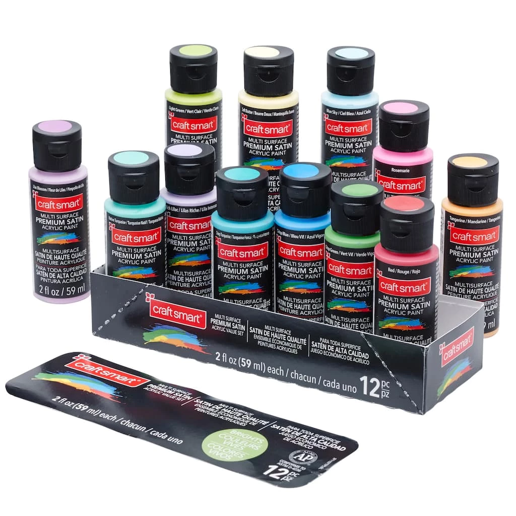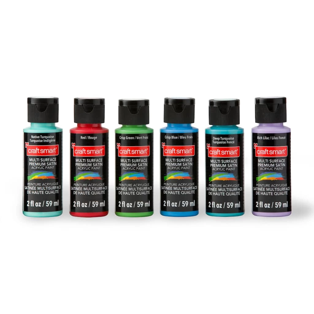 Create your own masterpiece with this Satin Acrylic Set by Craft Smart®. Bundled with assorted colors, this set is a must-have for crafting enthusiasts and artists. You can use these acrylics to paint book shelves, ceramic figurines, glass bowls, frames, and more.