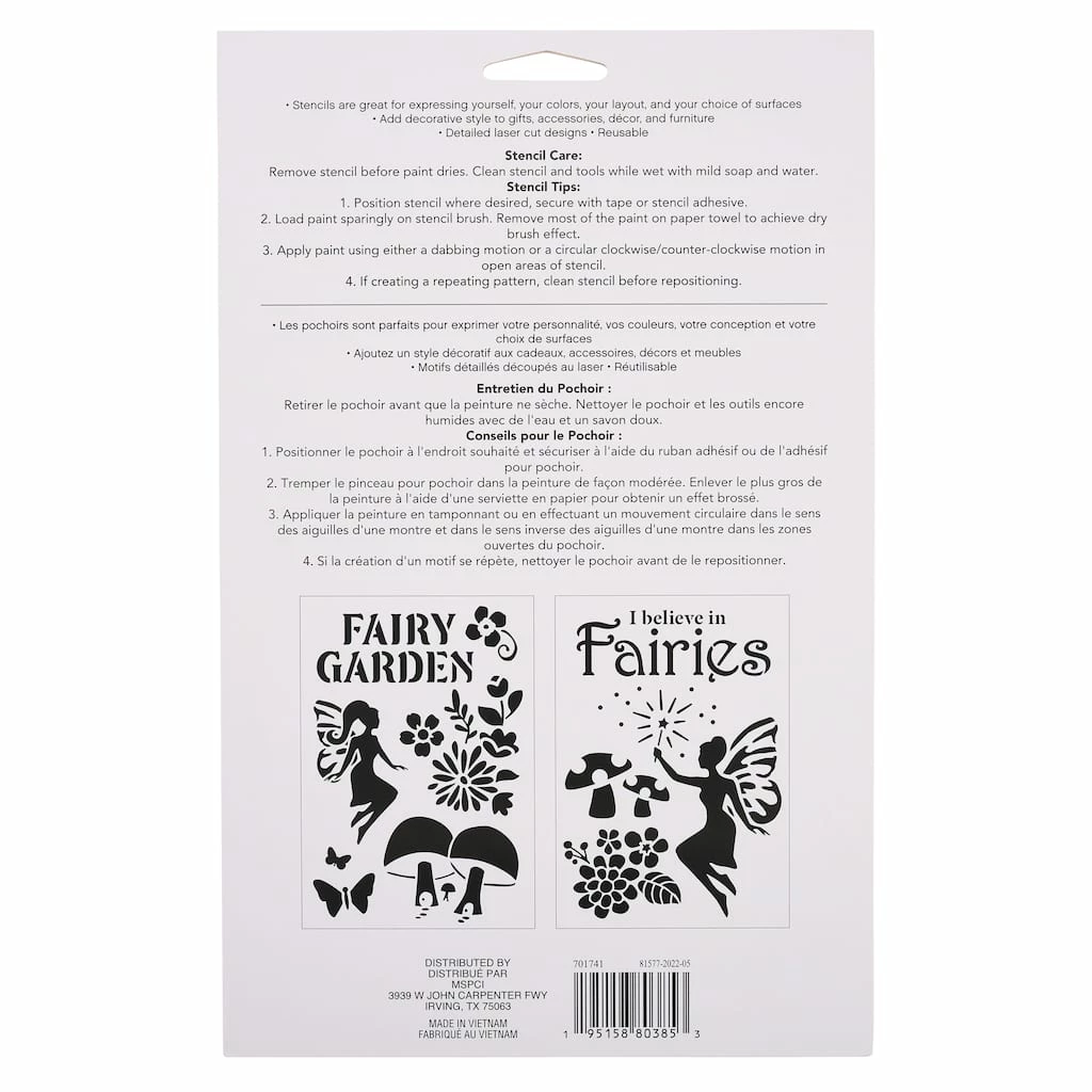 This sheet of stencils from Craft Smart can be used to add a lovely bit of magic to your garden dΓ©cor and craft projects. Use these designs featuring whimsical fairies, flowers and mushrooms to create fun wall plaques, decorate planters, paint accents on patio throw pillows and more!
