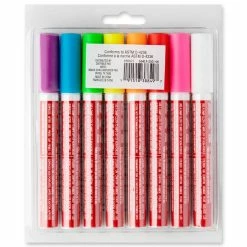 Write, draw and doodle designs on smooth surfaces with this set of chalk markers. These highly opaque wet-erasable markers can be used on chalkboards, windows, mirrors, ceramics and glass. The colors included are White, Fluorescent Pink, Fluorescent Red, Fluorescent Orange, Fluorescent Yellow, Fluorescent Green, Fluorescent Blue, and Fluorescent Violet.