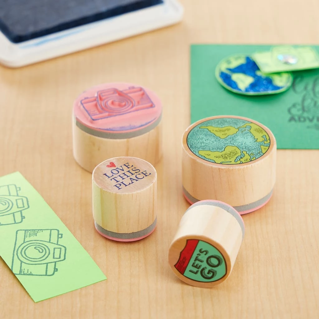 Create lovely patterns on your journal with these wooden stamps. With four travel-inspired designs, this stamp set is perfect to decorate your travelogue.