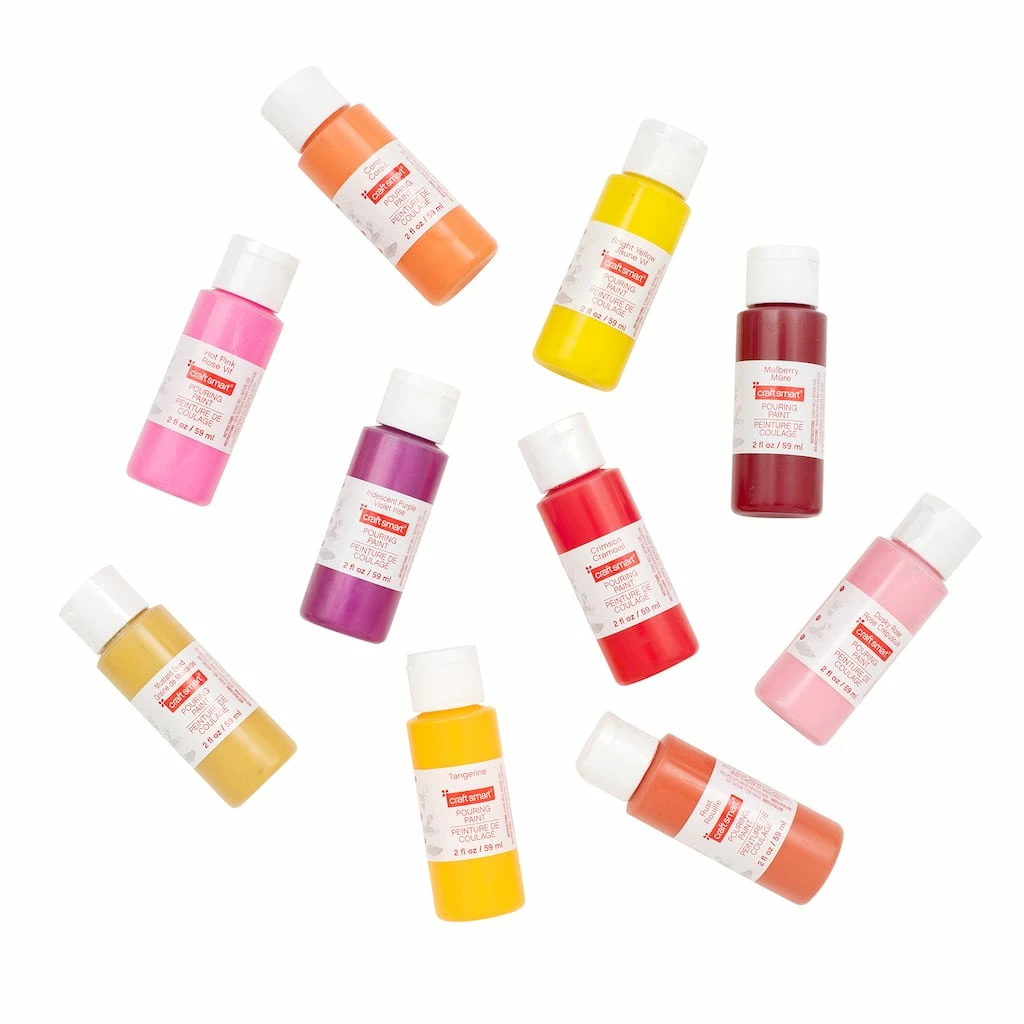 This pouring paint set is ideal for a variety of craft projects. This set features a variety of warm hues so the creative possibilities are endless! The colors of this set include:Β Iridescent purple, Coral, Crimson, Mulberry, Hot Pink, Dusky Rose, Tangerine, Rust, Bright Yellow, and Mustard Seed.