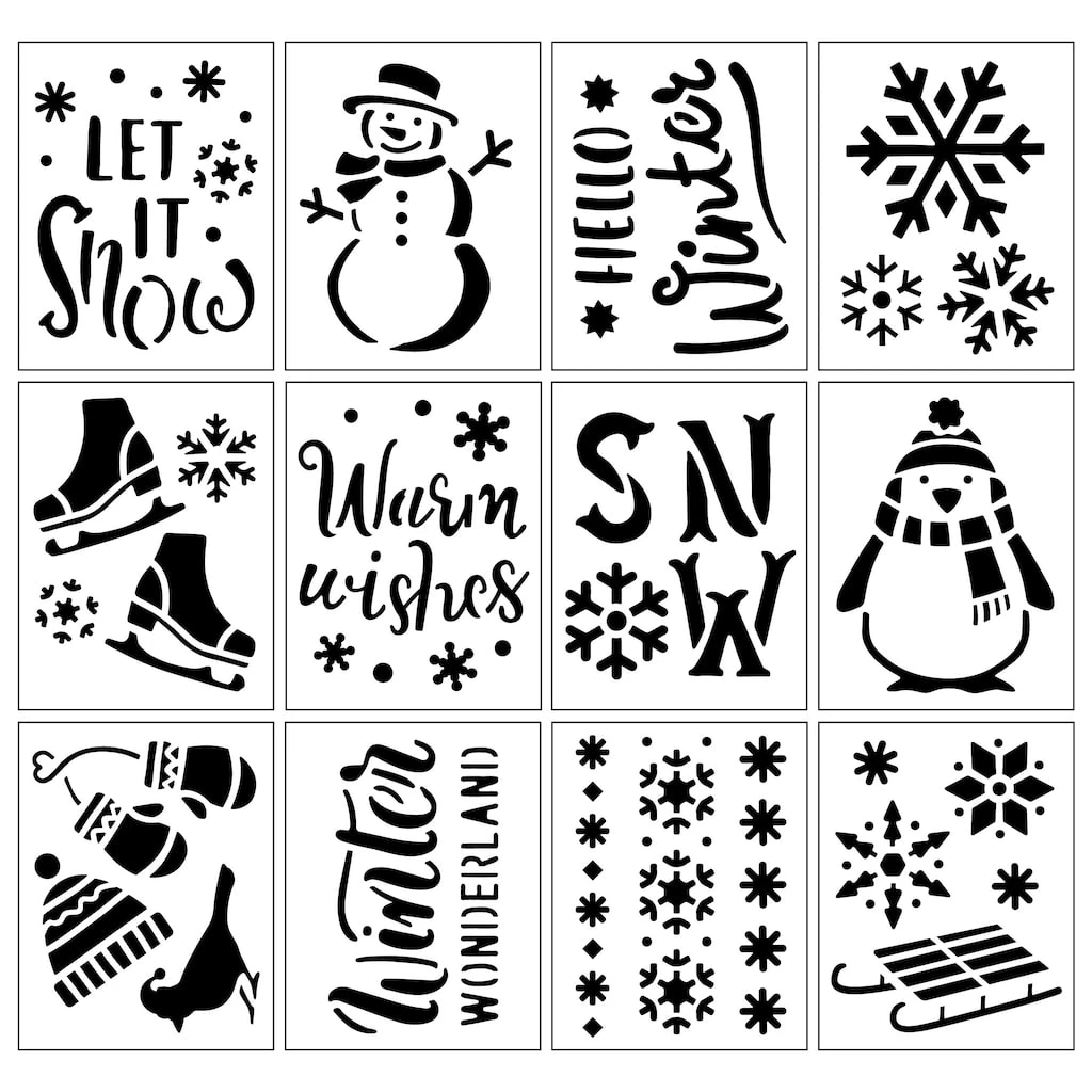 These winter-themed stencils are perfect for lending your DIY projects a festive vibe! This set features a variety of shapes, icons, and Christmas phrases.